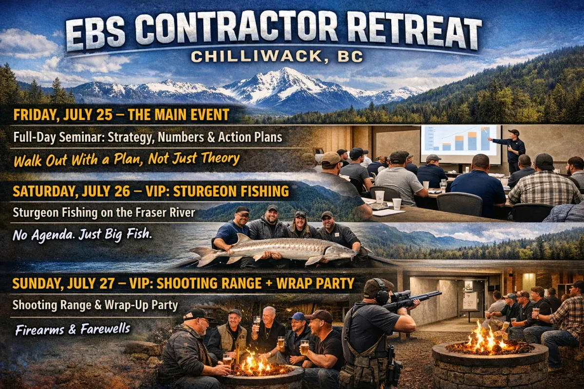 This event is for general contractors, renovators, custom home builders, and commercial outfits across North America. Owners who want systems, not guesswork. Leaders who will show up, do the work, and execute when they get home. This is not for tire kickers. This is not for people looking for a weekend away. This is for contractors who are serious about building a business that runs without burning them out.