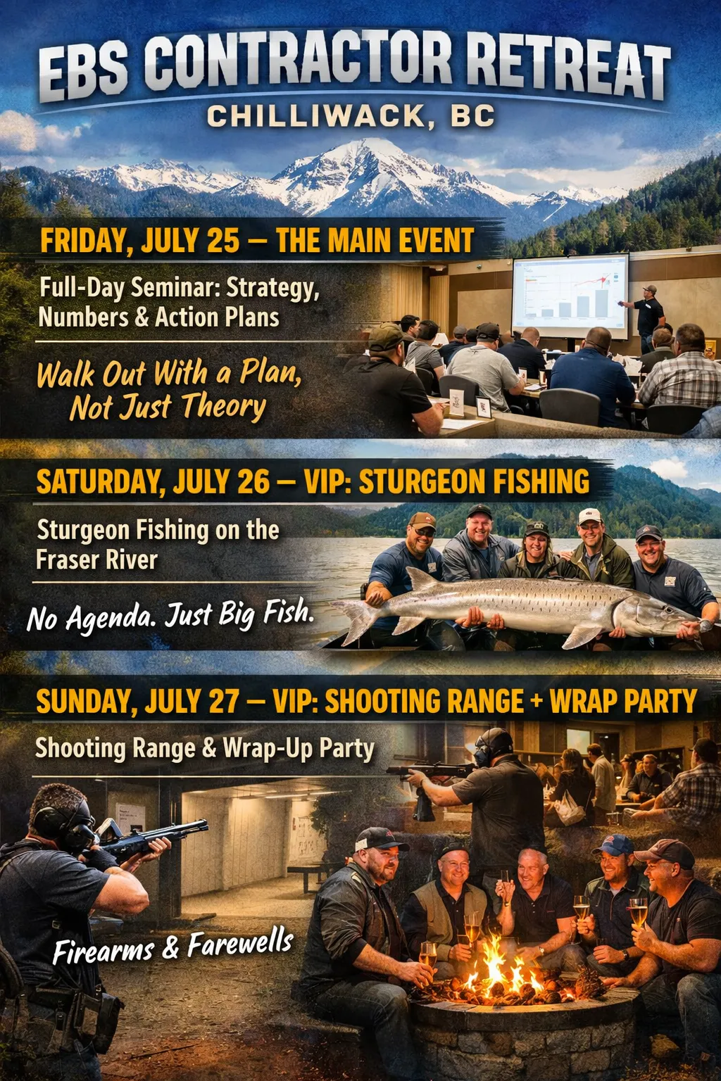 Everything in the Friday Seminar, plus two days you will not get anywhere else. Saturday you hit the Fraser River with Bent Rods Inc. for a sturgeon fishing trip with the group. Sunday starts at The Range in Langley, then closes out with a wrap-up get together. You get accountability pairing with another contractor in the room, extended time with speakers and coaching staff, and priority seating at all Friday sessions. Smaller group. Deeper conversations. Stronger connections. Friday gives you the strategy. Saturday and Sunday give you the people who will hold you to it.